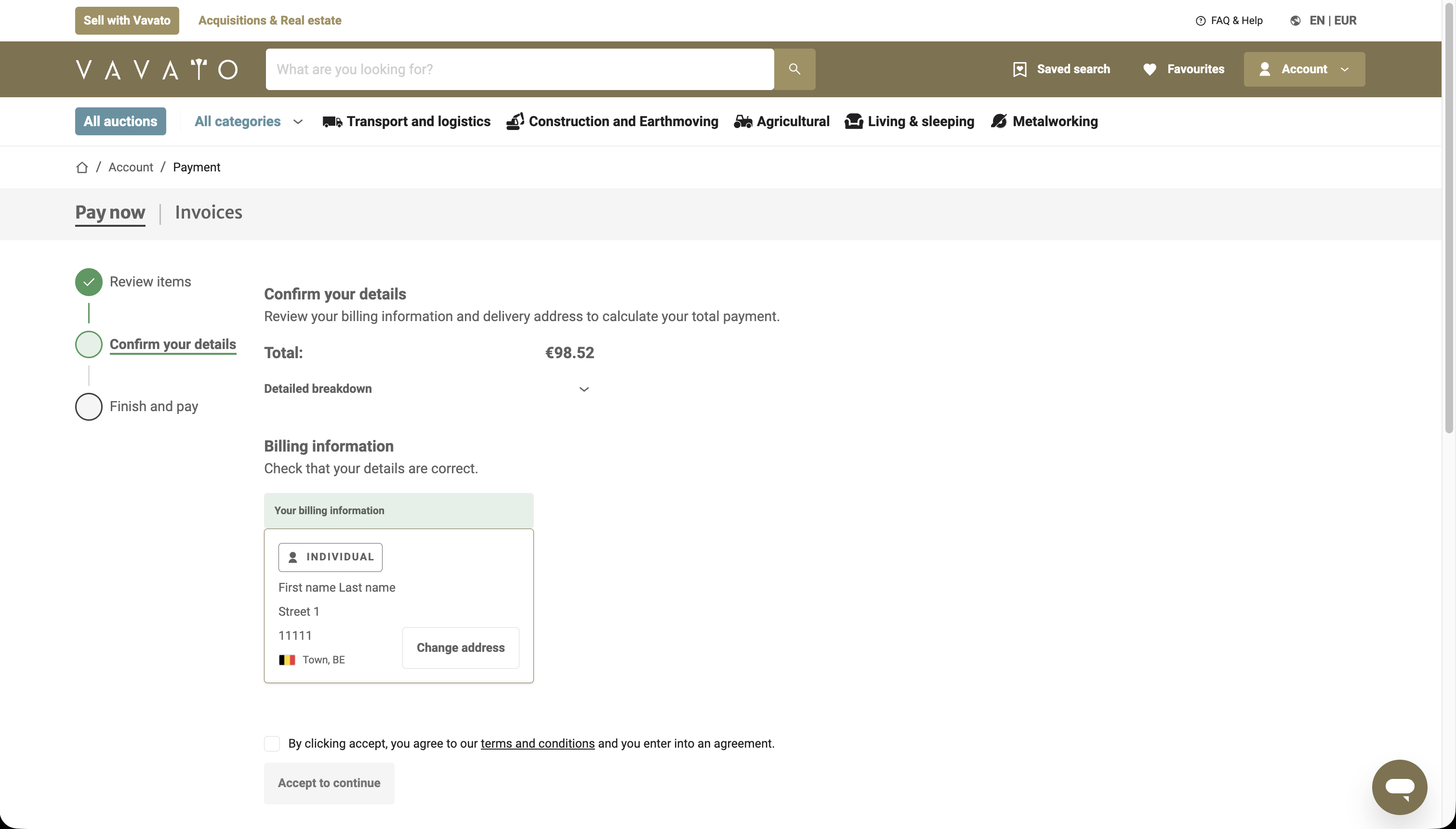 Review your billing and delivery details, as well as the total amount.